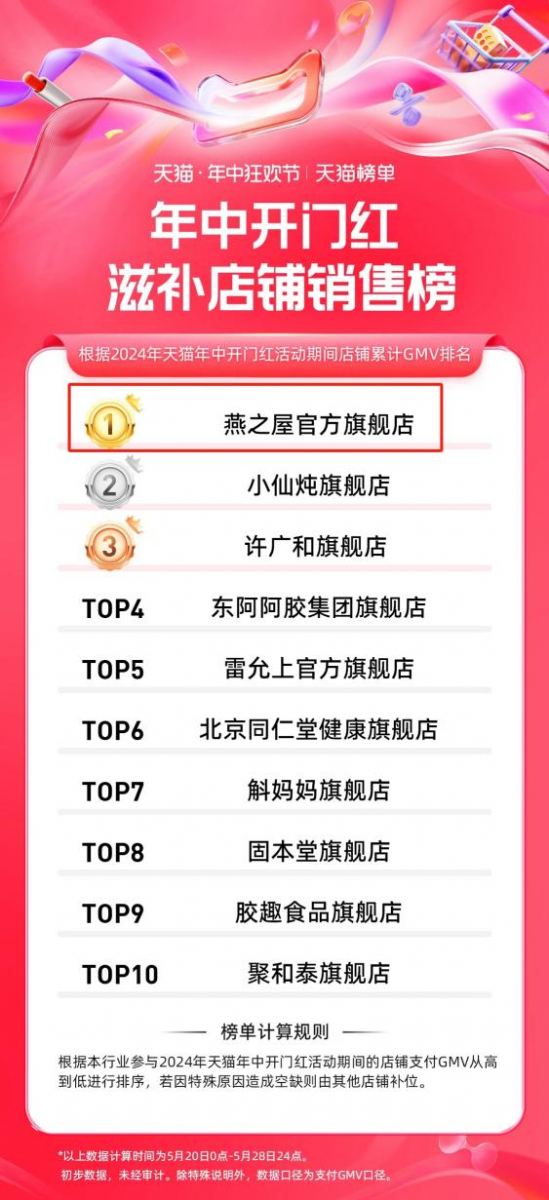 隨著618大幕拉開,第一波戰(zhàn)報火熱出爐。據阿里健康發(fā)布的2024年天貓年中開門紅健康行業(yè)成績單顯示,燕之屋官方旗艦店榮登滋補店鋪銷售榜第一、健康行業(yè)店鋪銷售榜第二,展現了燕之屋在品牌年輕化戰(zhàn)略中的深度思考和實踐能力。