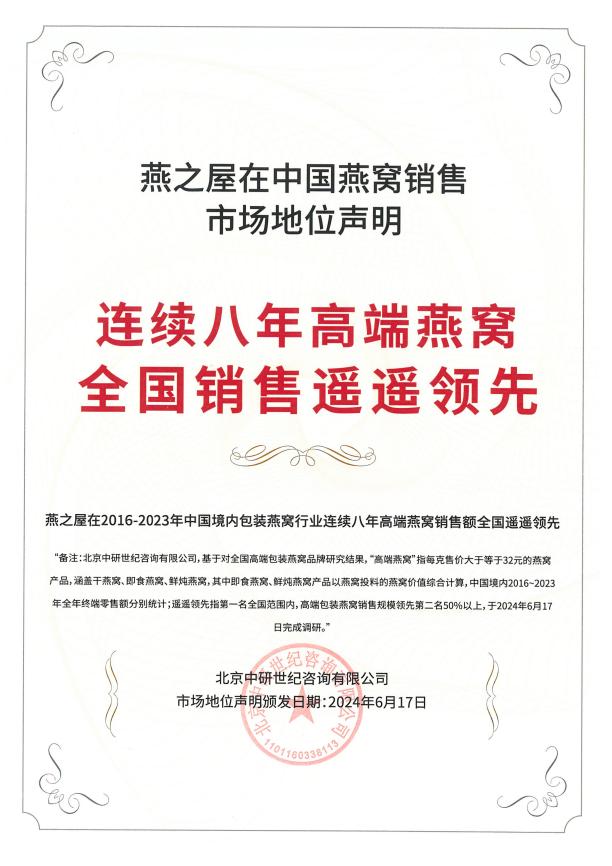圖:燕之屋連續(xù)八年高端燕窩全國銷售第一、燕之屋連續(xù)八年高端燕窩全國銷售遙遙領先
