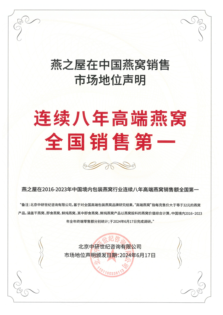 燕之屋26年專注高品質(zhì)燕窩,秉承“一碗好燕窩,滋潤(rùn)天下人”的初衷,致力于為消費(fèi)者提供更健康、更營(yíng)養(yǎng)、更美味、更便捷的燕窩滋養(yǎng),以卓越品質(zhì)塑造良好口碑。2019年,燕之屋正式入駐阿里健康大藥房,借助阿里健康平臺(tái)龐大用戶基礎(chǔ)及數(shù)字化能力,精準(zhǔn)定位消費(fèi)群體,拓寬營(yíng)銷渠道,更好地滿足消費(fèi)者的多元滋養(yǎng)需求,深度鏈接健康產(chǎn)業(yè)市場(chǎng)。截至2023年,燕之屋已連續(xù)八年高端燕窩全國(guó)銷售第一*(*燕之屋在2016-2023年中國(guó)境內(nèi)包裝燕窩行業(yè)連續(xù)八年高端燕窩銷售額全國(guó)第一,備注:北京中研世紀(jì)咨詢有限公司,基于對(duì)全國(guó)高端包裝燕窩品牌研究結(jié)果,“高端燕窩”指每克售價(jià)大于32元的燕窩產(chǎn)品,涵蓋干燕窩、即食燕窩、鮮燉燕窩,其中即食燕窩、鮮燉燕窩產(chǎn)品以燕窩投料的燕窩價(jià)值綜合計(jì)算,中國(guó)境內(nèi)2016-2023年全年終端零售額分別統(tǒng)計(jì);于2024年6月17日完成調(diào)研),并于港交所成功上市(股票代碼:01497.HK),其不僅是燕窩行業(yè)“領(lǐng)頭燕”,也是健康產(chǎn)業(yè)的一匹黑馬,奮勇前進(jìn),勢(shì)不可擋,展現(xiàn)蓬勃力量。