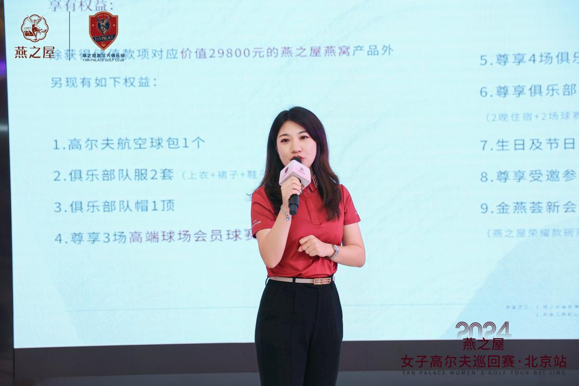 燕之屋26年專注高品質(zhì)燕窩,踐行“源于天然,美與健康”的理念,與高爾夫運(yùn)動(dòng)所蘊(yùn)含的健康生活理念深度契合。燕之屋以高爾夫運(yùn)動(dòng)為紐帶,在全國(guó)范圍內(nèi)建立燕之屋高爾夫俱樂(lè)部,致力于打造一個(gè)集高端賽事、精英沙龍、休閑交流于一體的綜合性平臺(tái),為廣大高爾夫愛(ài)好者提供了一個(gè)競(jìng)技交流、展示美、傳遞美的舞臺(tái),讓每一位成員都能在這里找到歸屬感,享受高品質(zhì)生活帶來(lái)的愉悅與滿足。席間,燕之屋北京高爾夫俱樂(lè)部秘書(shū)長(zhǎng)徐可上臺(tái)為嘉賓們?cè)敿?xì)介紹燕之屋高爾夫俱樂(lè)部,傳遞“因愛(ài)而生,為愛(ài)揮桿”健康理念,并向在座嘉賓發(fā)出會(huì)員邀請(qǐng)。
