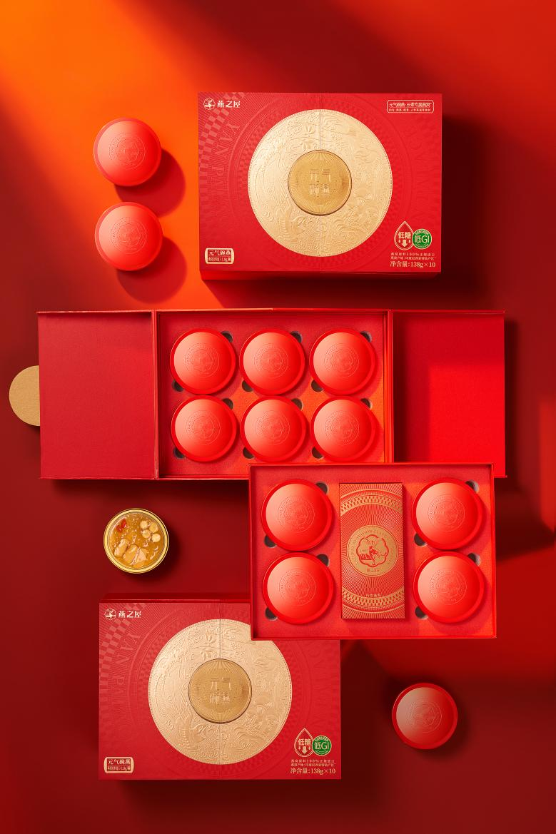 為長(zhǎng)輩挑選滋補(bǔ)好禮,煥新升級(jí)的碗燕·元?dú)饪疃Y盒實(shí)為優(yōu)先之選。中國(guó)紅與黃金色系的精美配搭,凸顯光亮色澤與尊貴質(zhì)感,大方得體,有禮有面。禮盒設(shè)計(jì)圍繞“圓”的概念,以年輪為設(shè)計(jì)意象,象征歲月賦予的智慧,也傳遞著圓滿之意。盒上刻畫金燕反哺動(dòng)人圖景,祥云繁花環(huán)繞其中,蘊(yùn)藏濃厚情意。獨(dú)特的對(duì)稱開(kāi)盒頗具巧思與創(chuàng)意,內(nèi)里雙層設(shè)計(jì),共承十碗珍饈碗燕·元?dú)饪睿瑵M載濃濃營(yíng)養(yǎng)與深切關(guān)懷,讓滋補(bǔ)觸手可及,關(guān)愛(ài)無(wú)處不在。